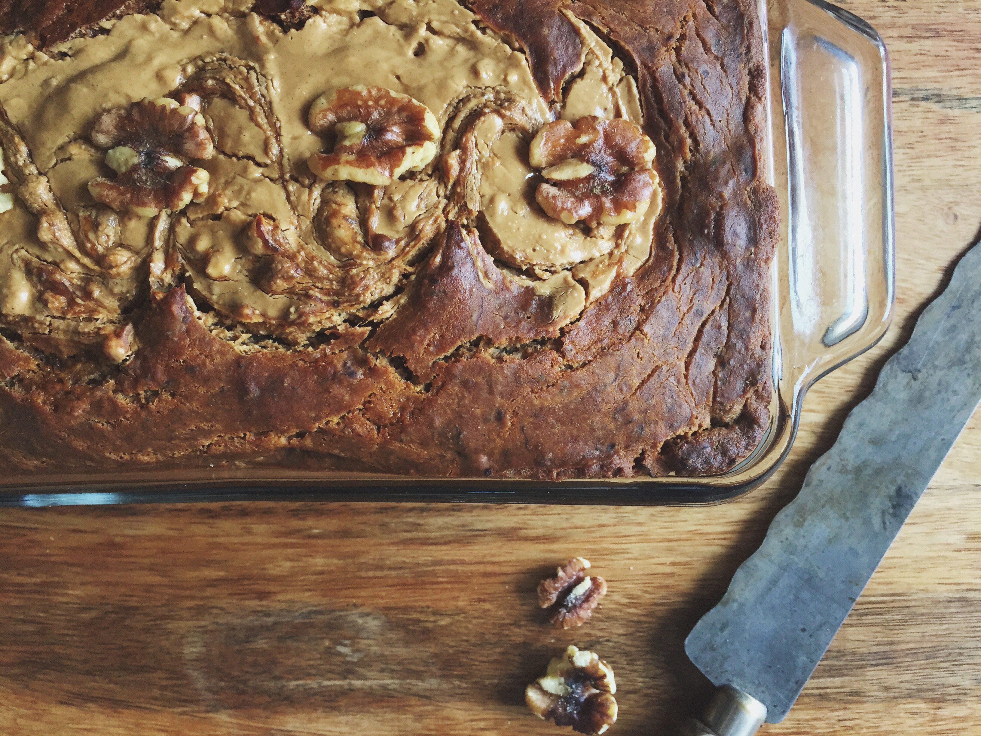 Then, melt the peanut butter in the microwave for about 30-45 seconds, and swirl into the top of the batter. Top with walnut halves.
